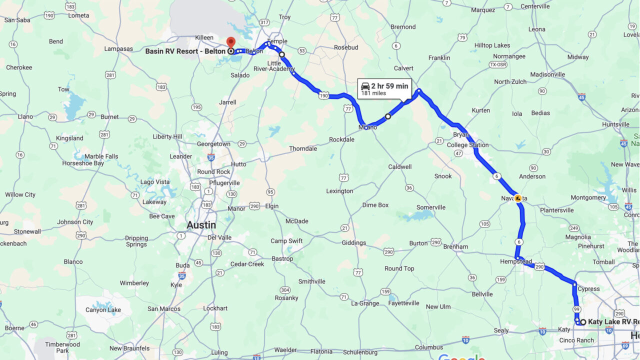After our overnight stop outside Houston, we then traveled 180 miles northwest to Basin RV Resort in Belton TX. We saw obvious signs of spring flooding during the drive from the Houston area. We’re here in Belton for three nights visiting (brother) Andy and (sis) Linda who call this beautiful park home several months out of the year. Gary and I are feeling blessed as we were also able to visit with so many family members during this short visit! All would make great pod members… just sayin!