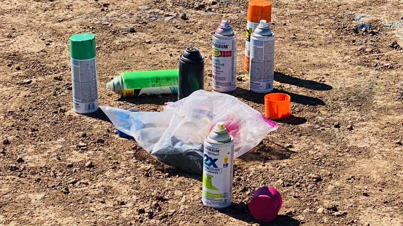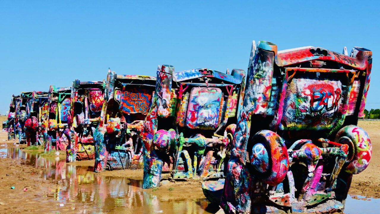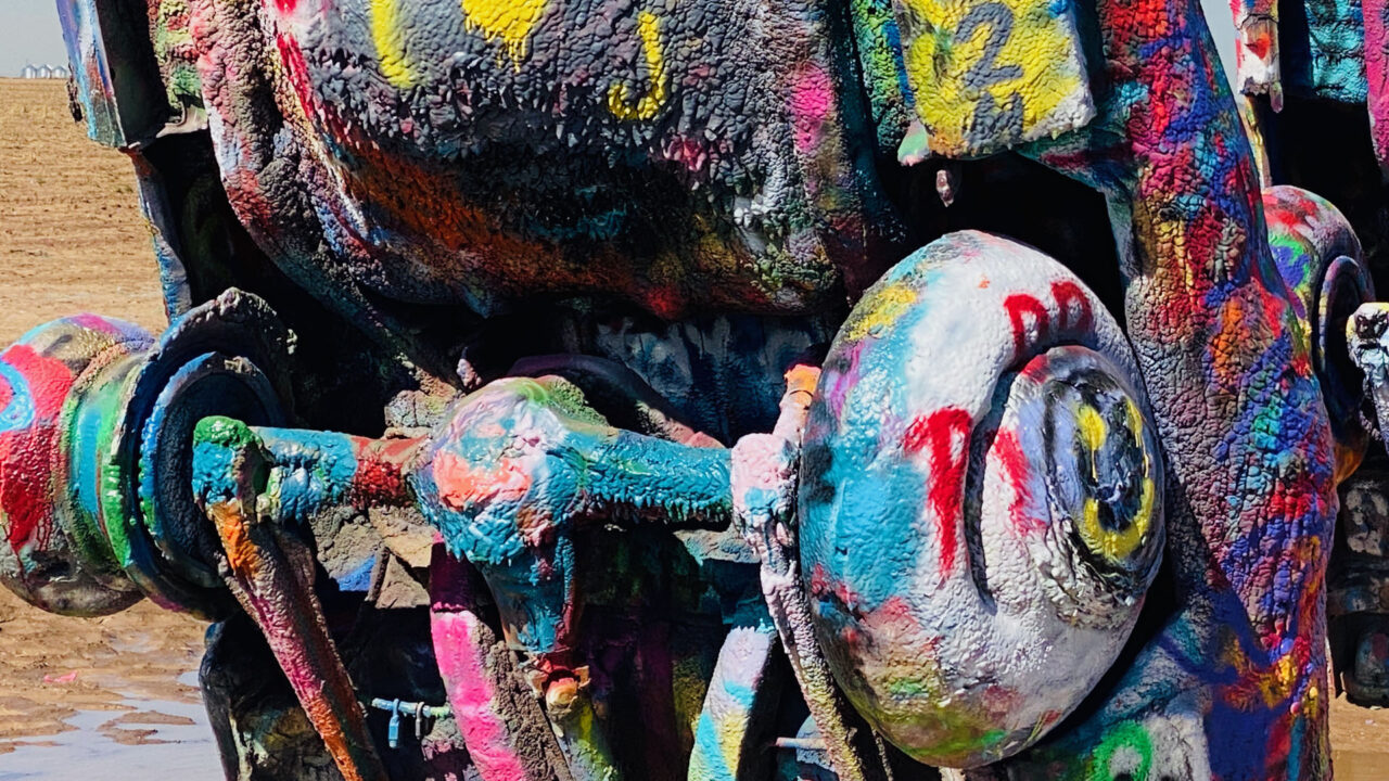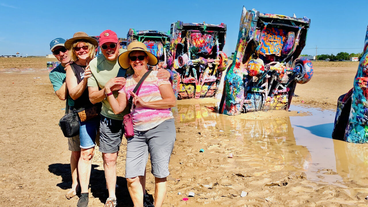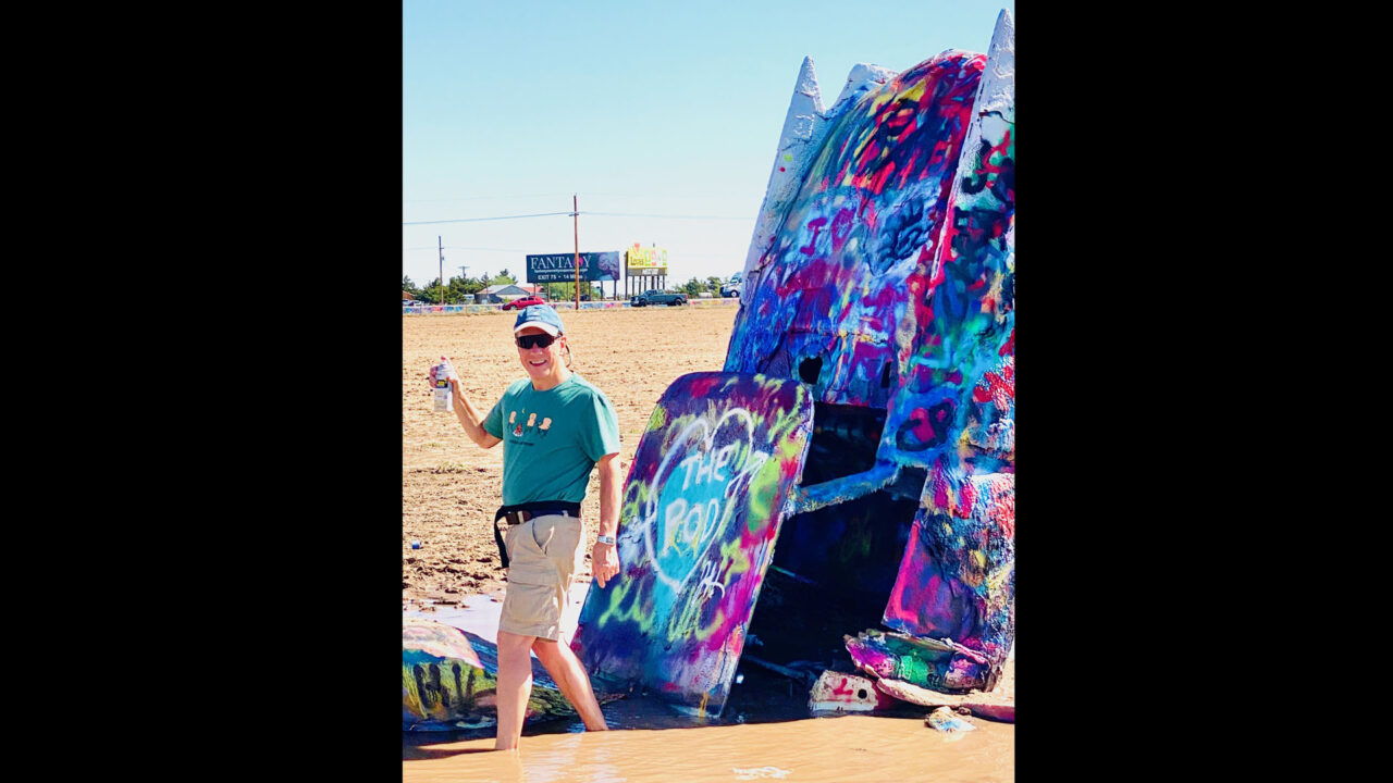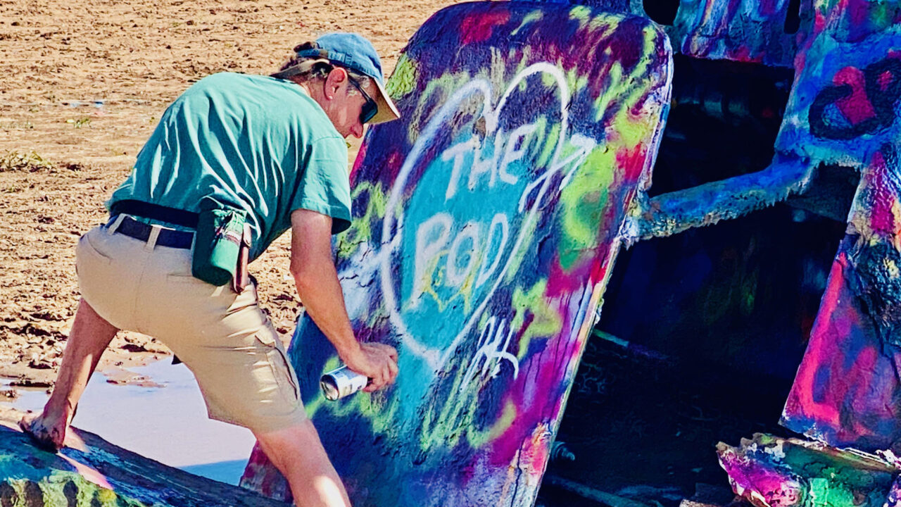 The “art” is a row of 10 vintage Cadillacs, covered in graffiti, partially buried in the ground at a 60-degree angle (supposedly to match that of the Great Pyramid of Giza in Egypt). The Cadillacs have now been in the ground as art longer than they were on the road as cars. You can smell the spray paint as you start walking towards them. Lots of partially used paint spray cans lie on the ground waiting for the next budding artist to add his/her mark. One of our pod members got into the act!