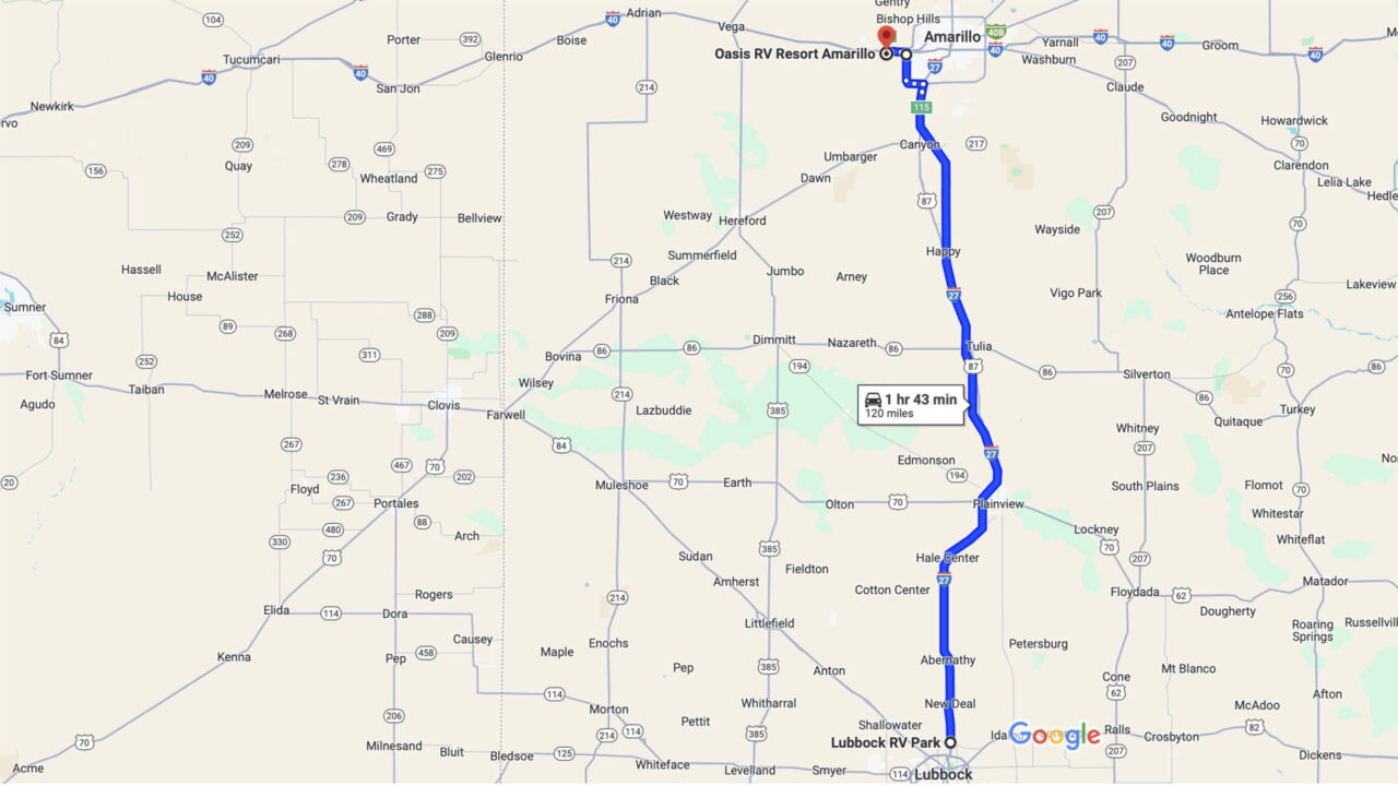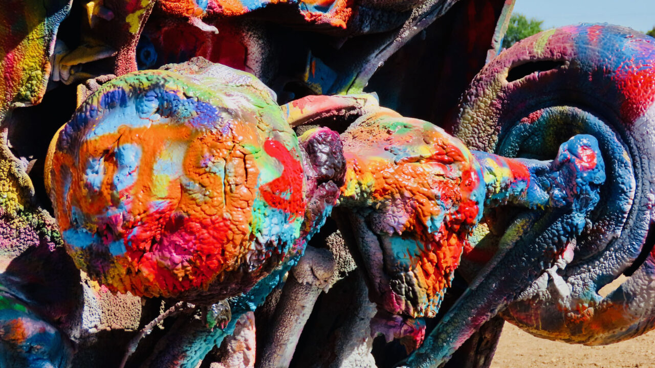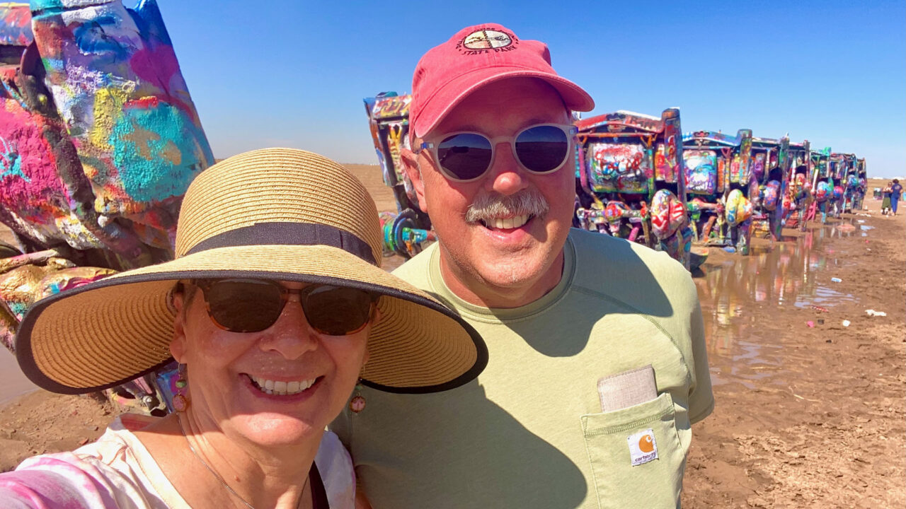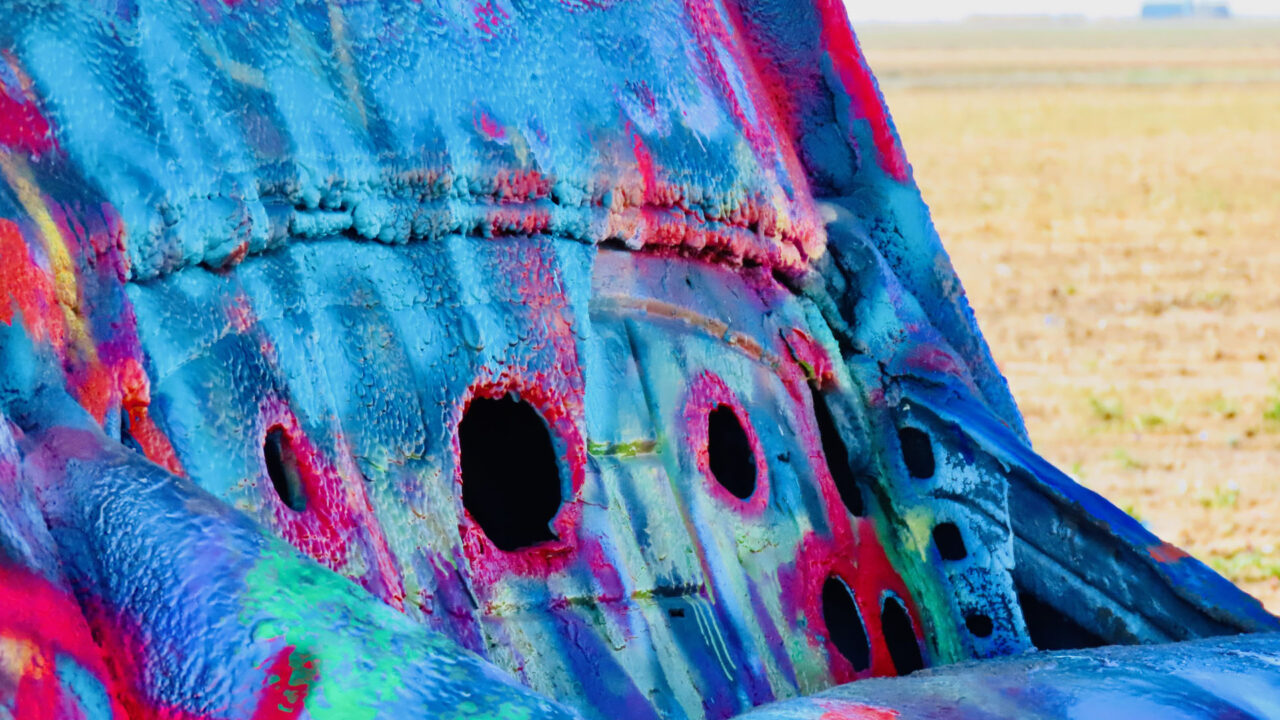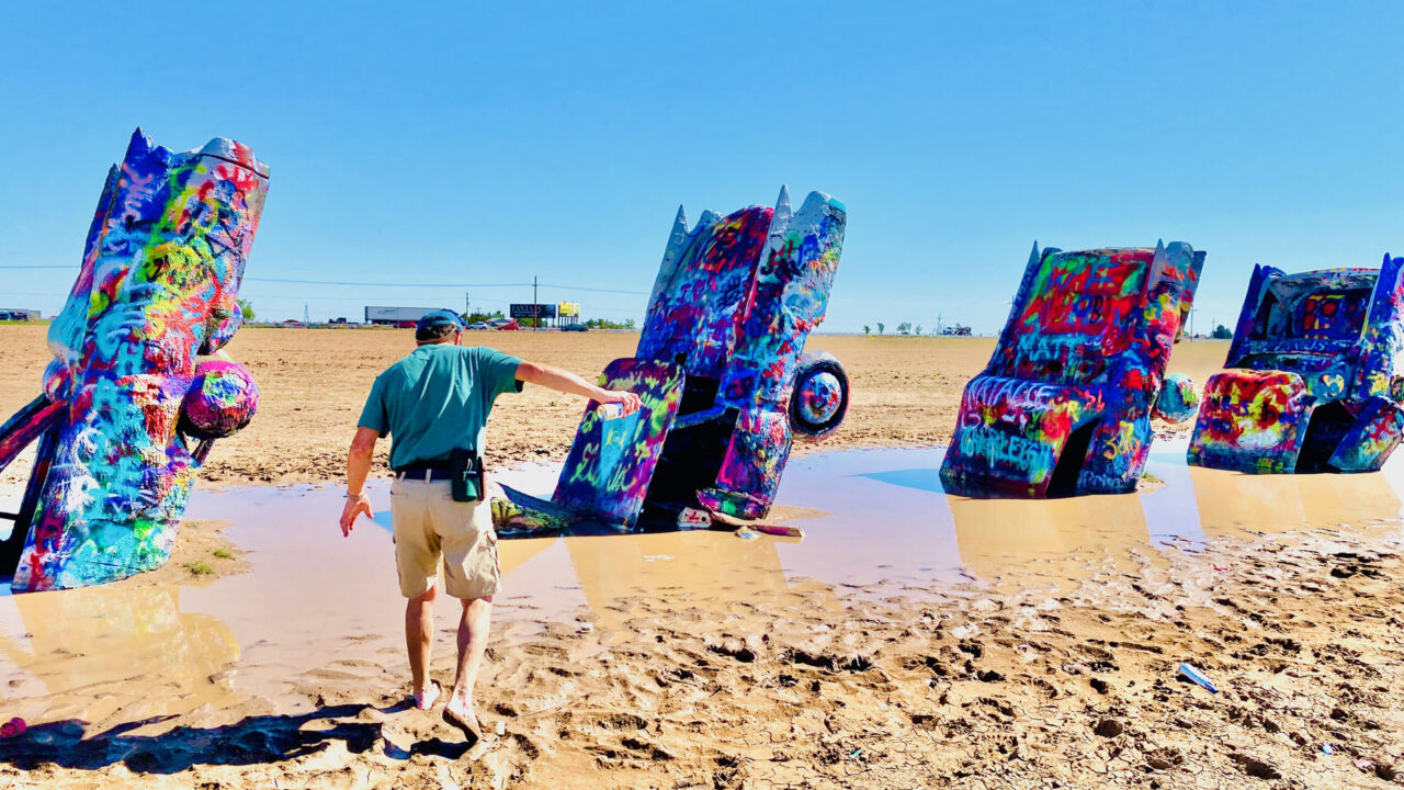 After San Angelo, the pod traveled 200 miles north to spend 2 nights at Lubbock RV Park. Along the drive we saw lots of oil rigs and the controlled burning, or “flaring” as it’s called, of excess natural gas. We also saw fields ready for planting. While in Lubbock, we caught up on admin stuff, grocery shopping, and making some reservations. On Sunday, May 19th, (2024) we traveled another 120 miles to Amarillo to stay at Oasis RV Resort, and on Monday we visited Cadillac Ranch located 5 minutes from the campground on old Route 66. It was invented and built in 1974 by a group of “art-hippies” imported from San Francisco. They called themselves The Ant Farm, and their silent partner was Amarillo billionaire Stanley Marsh III. He wanted a piece of public art that would baffle the locals. I think he succeeded!
