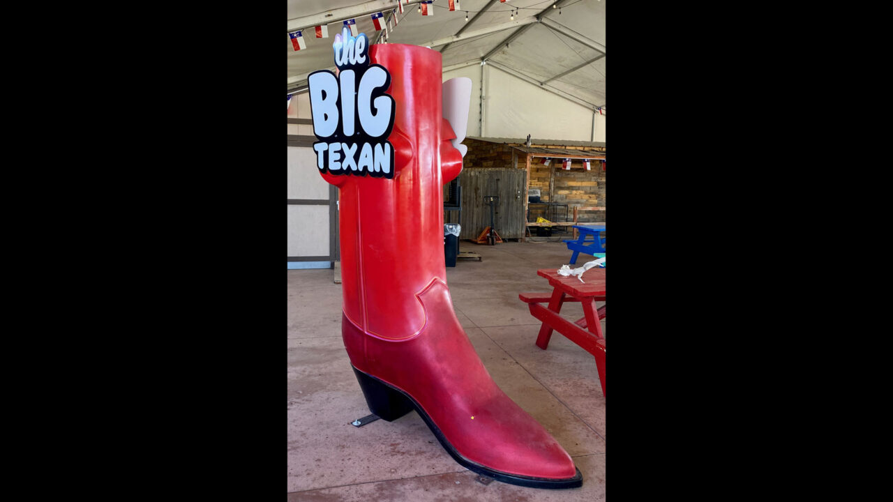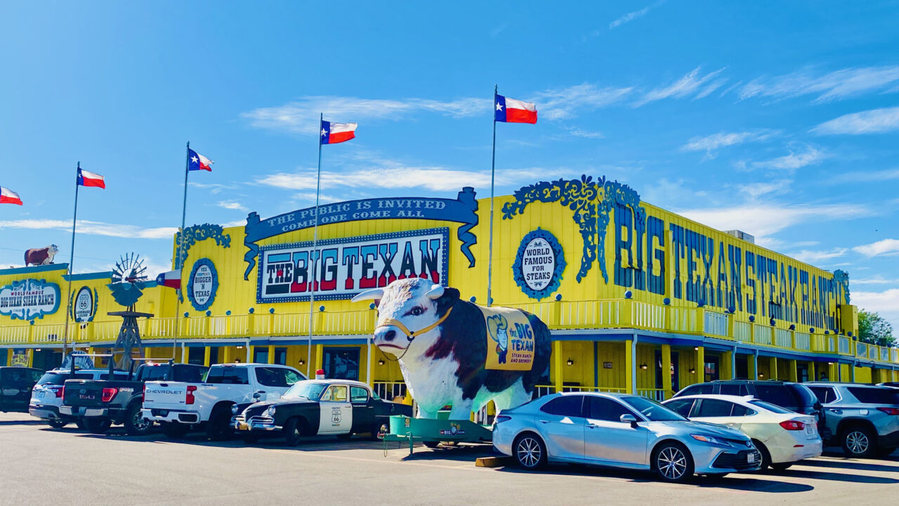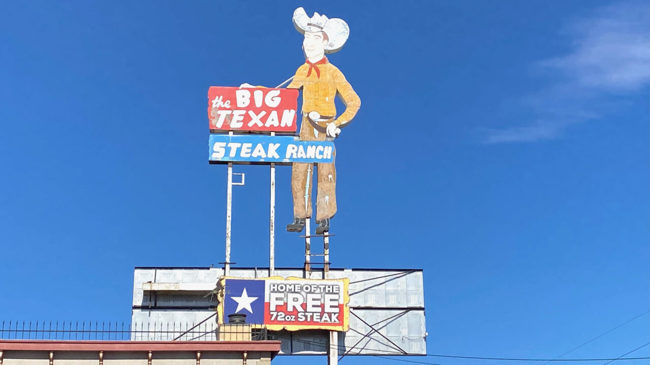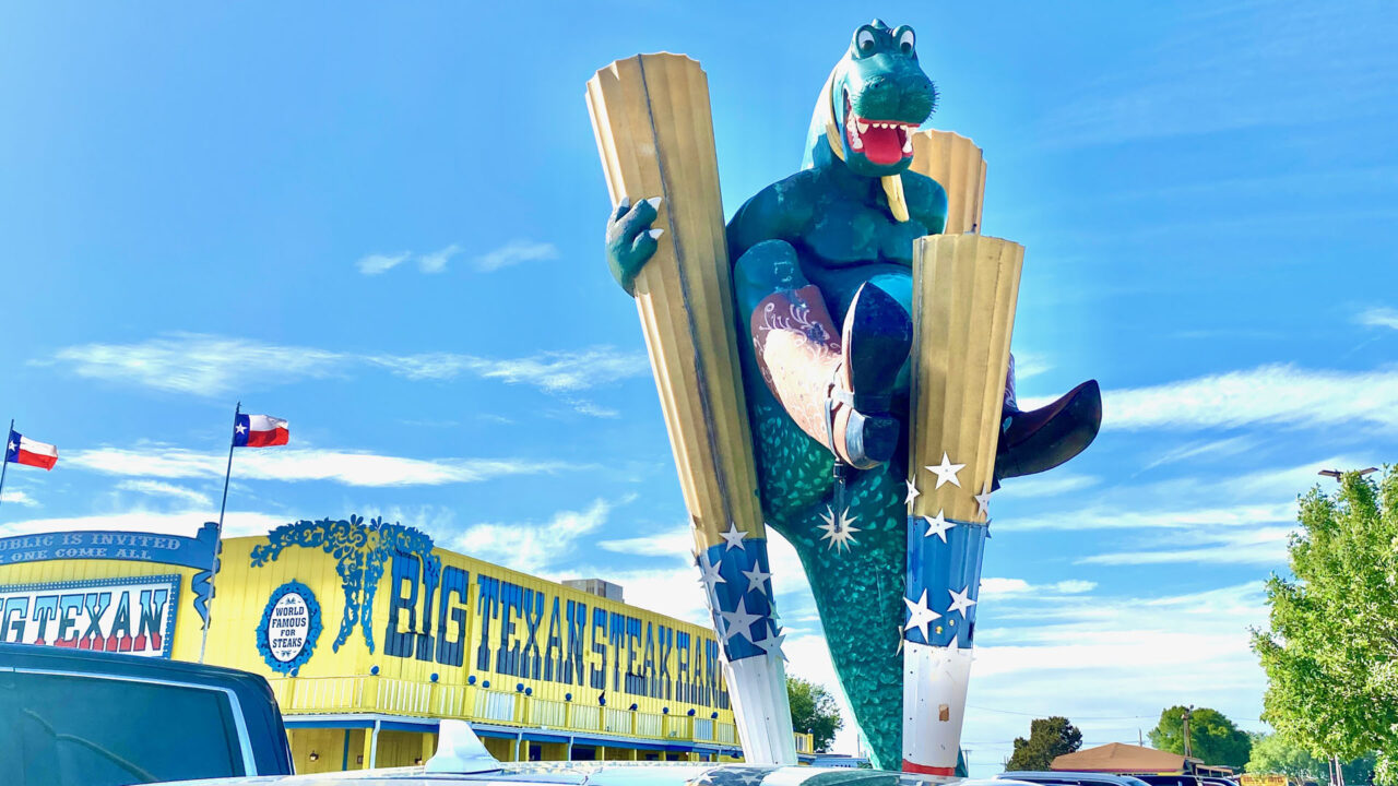 We enjoyed “linner” at The Big Texan Steak Ranch in Amarillo. A “must” when in this area! In 1960, R. J. “Bob” Lee opened his restaurant on Route 66, the “Mother Road”. Its distinctive architecture (including mounted animal heads throughout the dining room) soon became recognized across the Mother Road as a good stopping place for great steaks grilled over an open flame. The Big Texan is famous for the “FREE 72 oz steak challenge”, which includes eating a salad, baked potato, 3 shrimp and 72 ounces of beef in one hour. None of us tried that although there was one diner who did. He was seated on an elevated platform so everyone could watch while the clock counted down the 60 minutes. If he finishes, he gets his dinner for free. The countdown clock showed about 20 minutes left. We did not stick around to see the outcome. Even without attempting to eat a 72 oz steak, we all had enough leftovers for dinner another night! A fun experience!