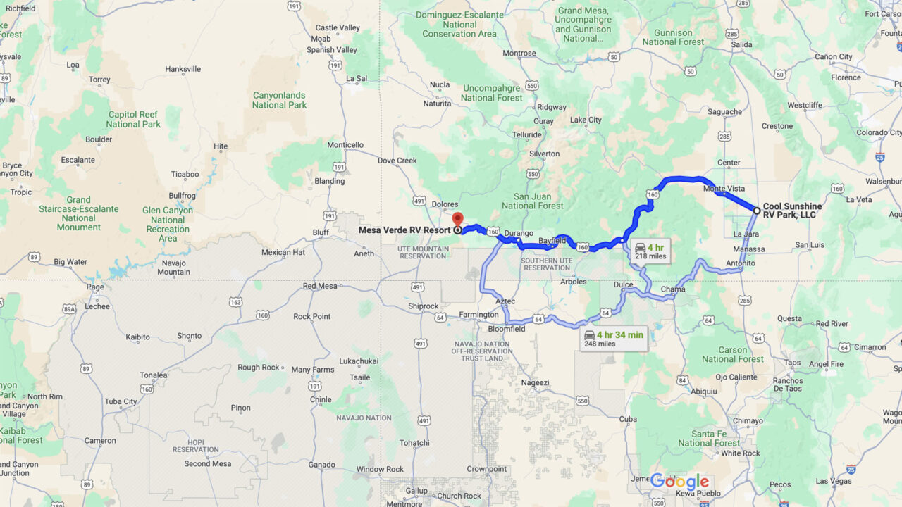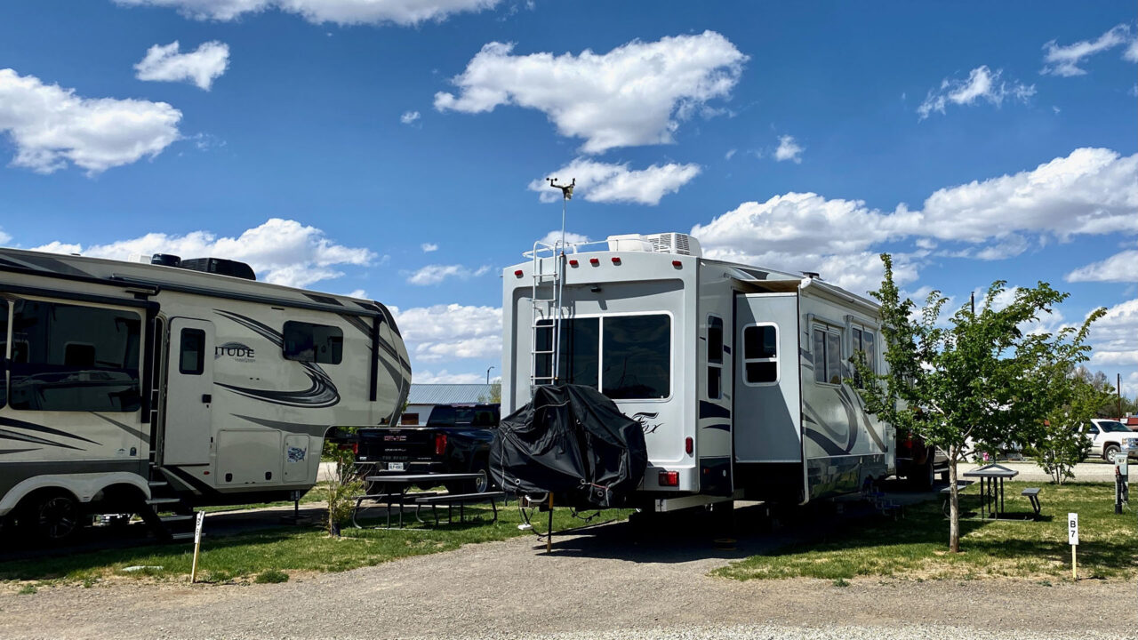 Wow, wow, wow! Gorgeous drive today, Friday, May 24th, (2024) from Alamosa to Mancos, Colorado… 183 miles of snow-capped mountains, lush green forests, cattle ranches and some very mountainous roads with hairpin turns. Kudos to Gary for great driving! Also nice to be parked for a week at Mesa Verde RV Resort. We were supposed to have premium sites, which we booked a year ago. However, our reservations didn’t transfer to this year’s booking system soooo we’re in standard sites which are tighter. Ah well. There are far worse problems we could have. Mary is parked a row over. Let the weekend begin!