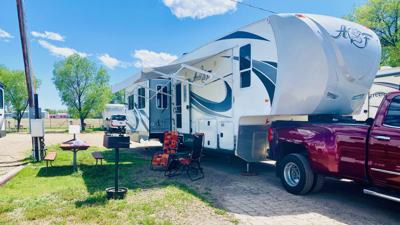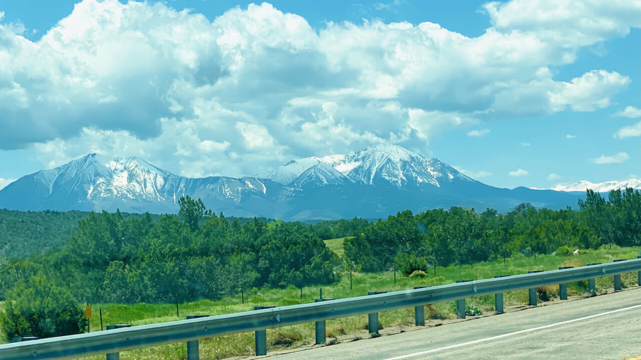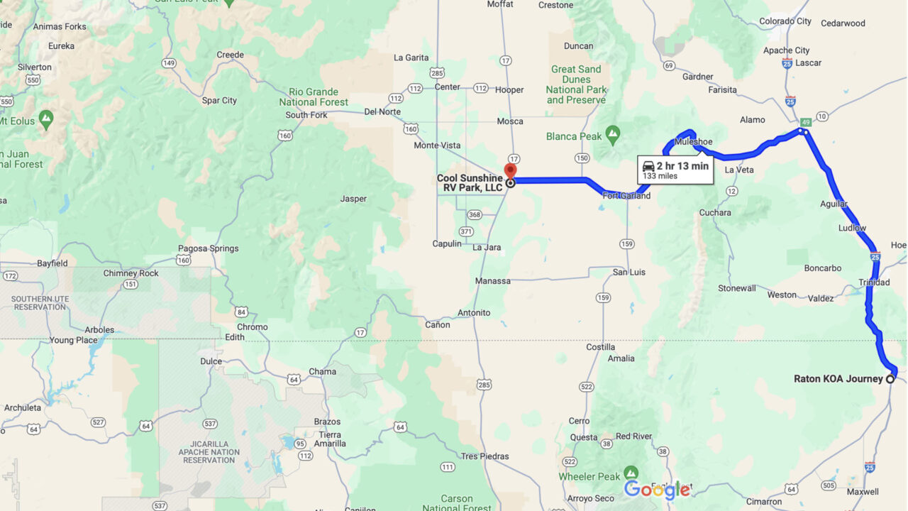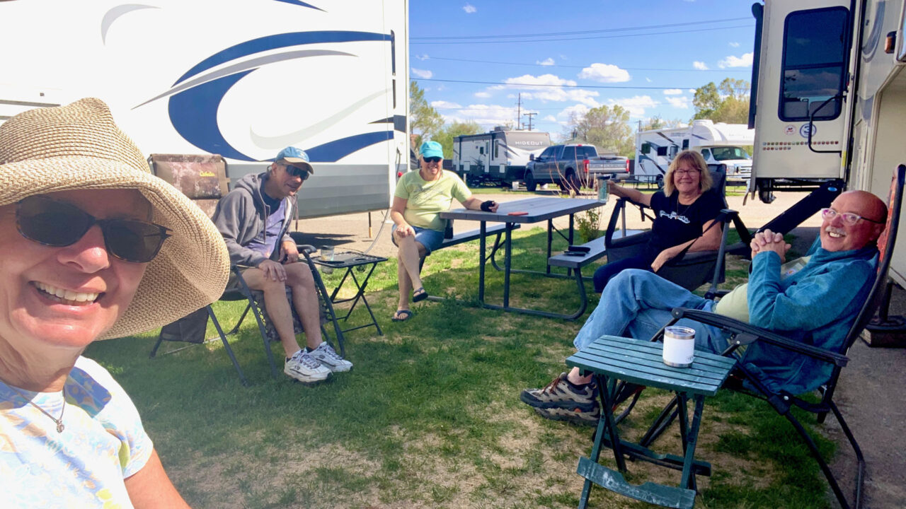 On Wed., May 22nd, (2024) the pod traveled 133 scenic miles from Raton, NM northwest to Cool Sunshine RV Park in Alamosa, CO for 2 nights. Once again, we saw beautiful snow-capped mountains for miles and miles, and lots of snow fences visible across these wide open spaces. We even have a mountain view from our campground. Such a gorgeous part of the country. As an added special bonus we met up with our awesome NH friend Mary here in Alamosa. She will be traveling with us for about 6 weeks in her motor home. So fun to get a NH fix with her visit! Our pod has now increased to 5, and we enjoyed our first Happy Hour together upon arrival! The following day Gary & I did chores, hosted dinner at our tiny home, played golf (card game), and took an evening walk with everyone.