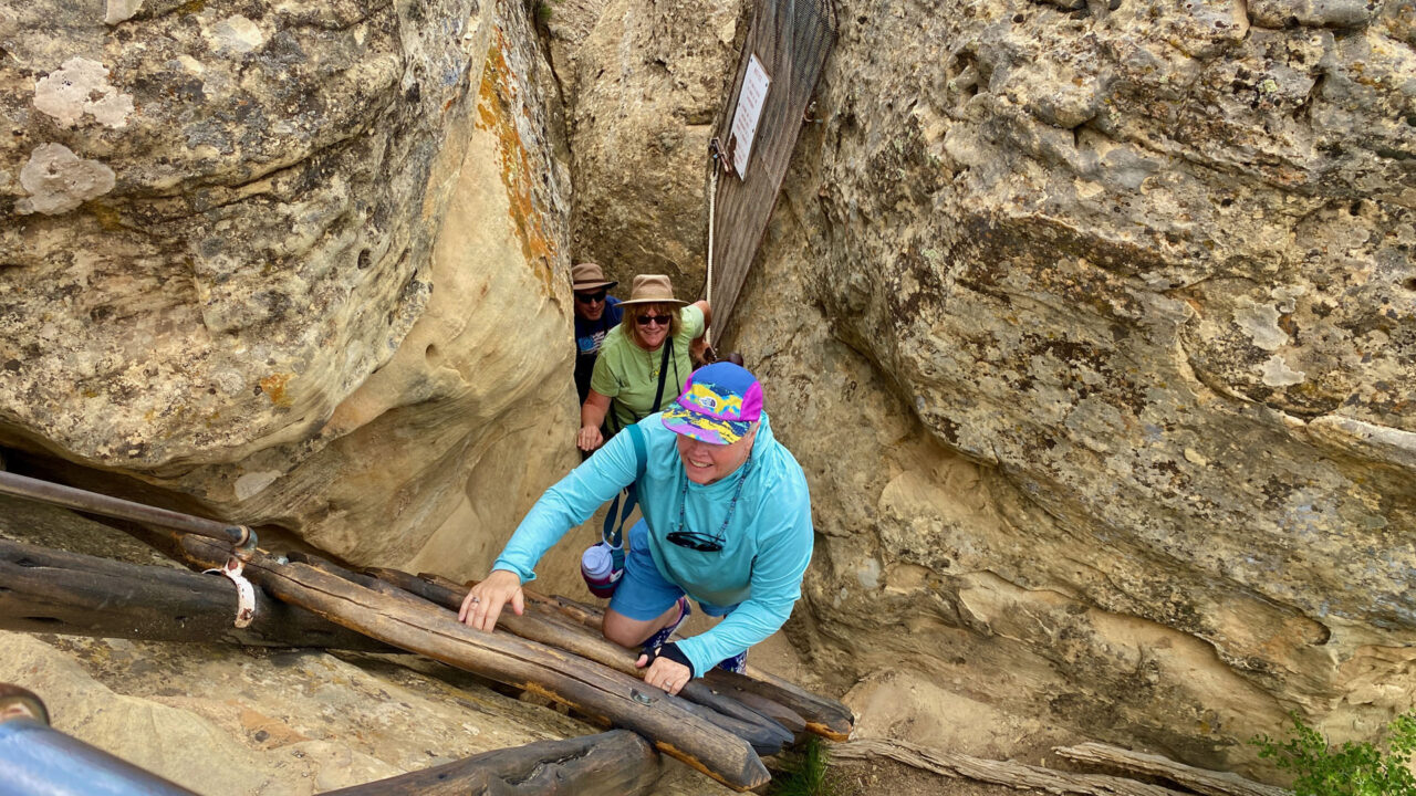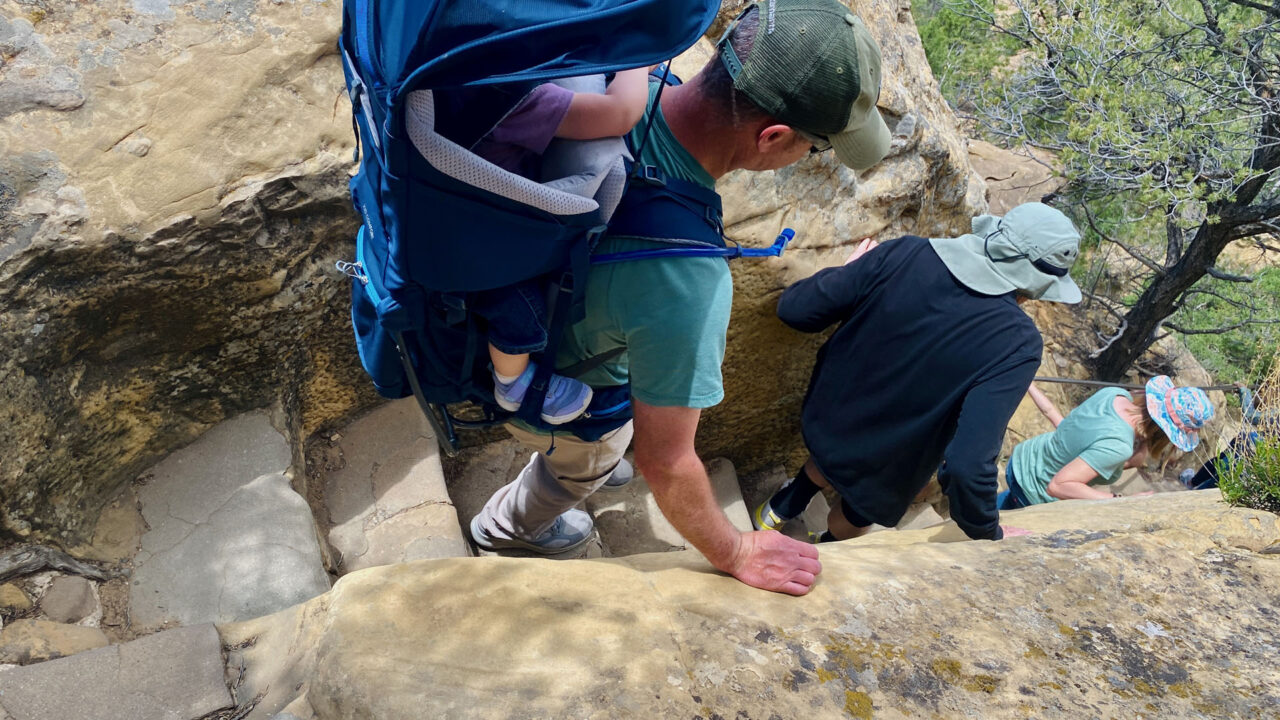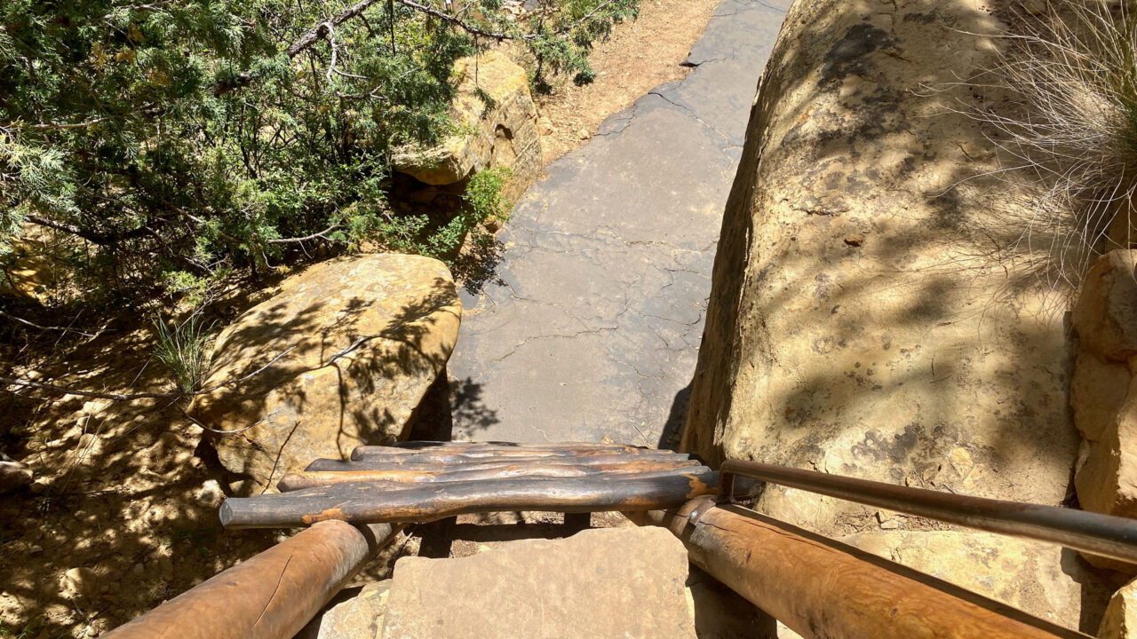The second day in Mesa Verde NP we did a Ranger led tour down into the largest of the cliff dwellings called Cliff Palace, which has 150 rooms and 21 kivas (gathering spaces). To take part in the tour, it meant a 100-ft descent over uneven stone steps, and climbing four, 8-to-10 ft ladders with a 100-ft vertical climb to exit the site. Totally worth the effort! Many believe that Cliff Palace was originally built to function as a social or gathering place for ceremonies. It’s constructed from sandstone, wooden beams, and mortar made from soil, water and ash. The Ancestral Pueblo people shaped the sandstone blocks, used wooden beams to support structures, and created a durable mortar to bind the stones. Amazing!