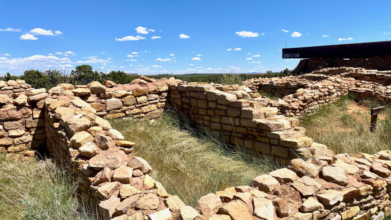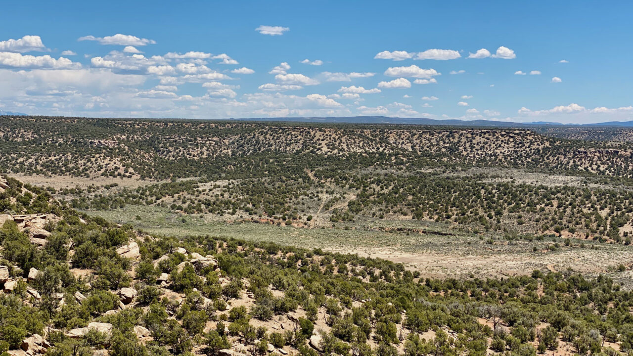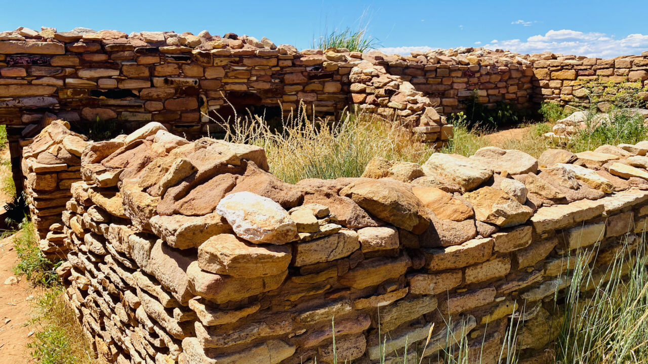 If we were to have driven the entire monument area it would have been 89 miles. We drove part of it. First was 35 miles over roads that were paved then gravel then washboard… to Painted Hand Pueblo, originally a small village of about 20 rooms in AD 1200, now a partial tower remains and ruins. We opted to view from a distance rather than attempt the 3/4 mile hike on a hot day at 6,000 ft elevation.