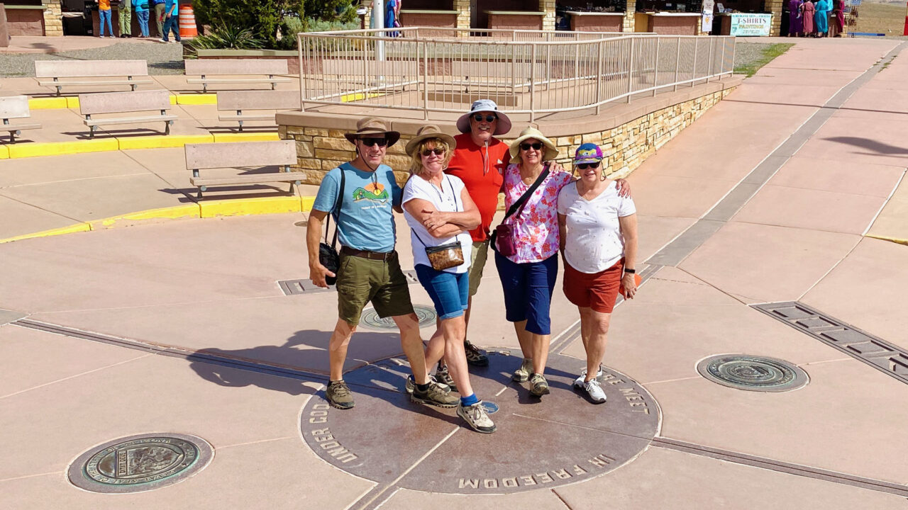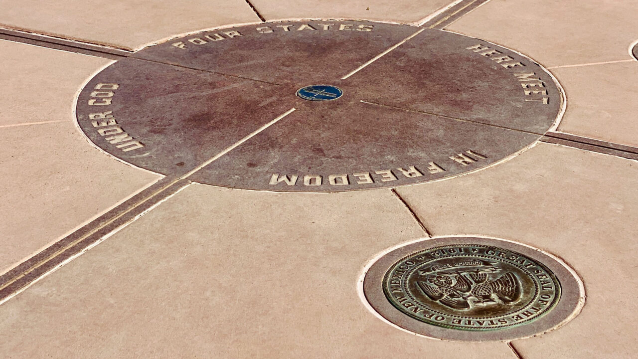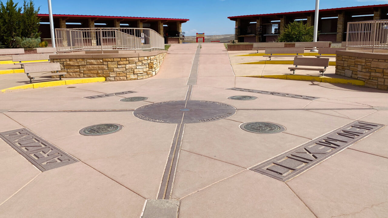 Wednesday, May 29th, (2024), we visited the Four Corners Monument. It’s the only place in the U.S. where four states meet or, stating it more eloquently, “marking the common corner of 4 states” – Colorado, New Mexico, Arizona and Utah. It was established by U.S. Surveyors and Astronomers beginning in 1668 and has been challenged and upheld numerous times in court! The site sits on Navajo tribal land. We stood on the spot where the marker on the ground reads “Four States Here Meet In Freedom Under God.”