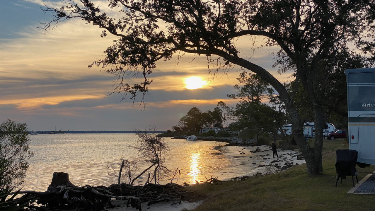 We are back in Central Time zone. Our site at the state park is a little slice of heaven. We have a spectacular view of the Gulf. Our camping reservation is for 8 nights. The Hannafords are parked a little away from us… coincidentally, they are close to the cement bathhouse/rest room. That comes into play a little later in this story.