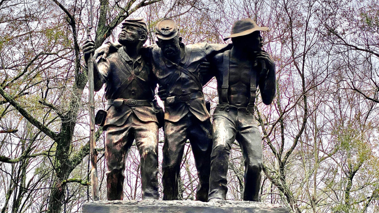 • The Mississippi African-American Monument is a 3,000 pound, 9-foot tall, bronze sculpture resting on a pedestal of African black granite depicting a black soldier and a civilian laborer helping a wounded black soldier from the field of battle. 178,000 free black men and former slaves served during the last two years of the war. They proved early on that they were willing and able to fight. On June 7, 1863 45% of the 9th Regiment of African Descent were killed or mortally wounded in Vicksburg, the highest proportion of any unit in one fight during the entire war.