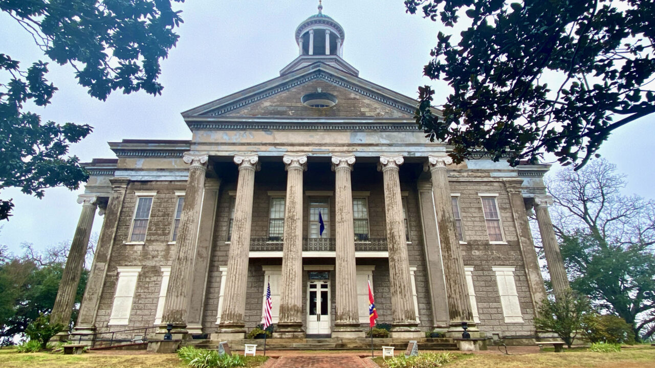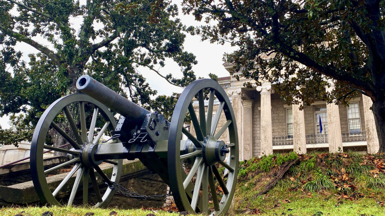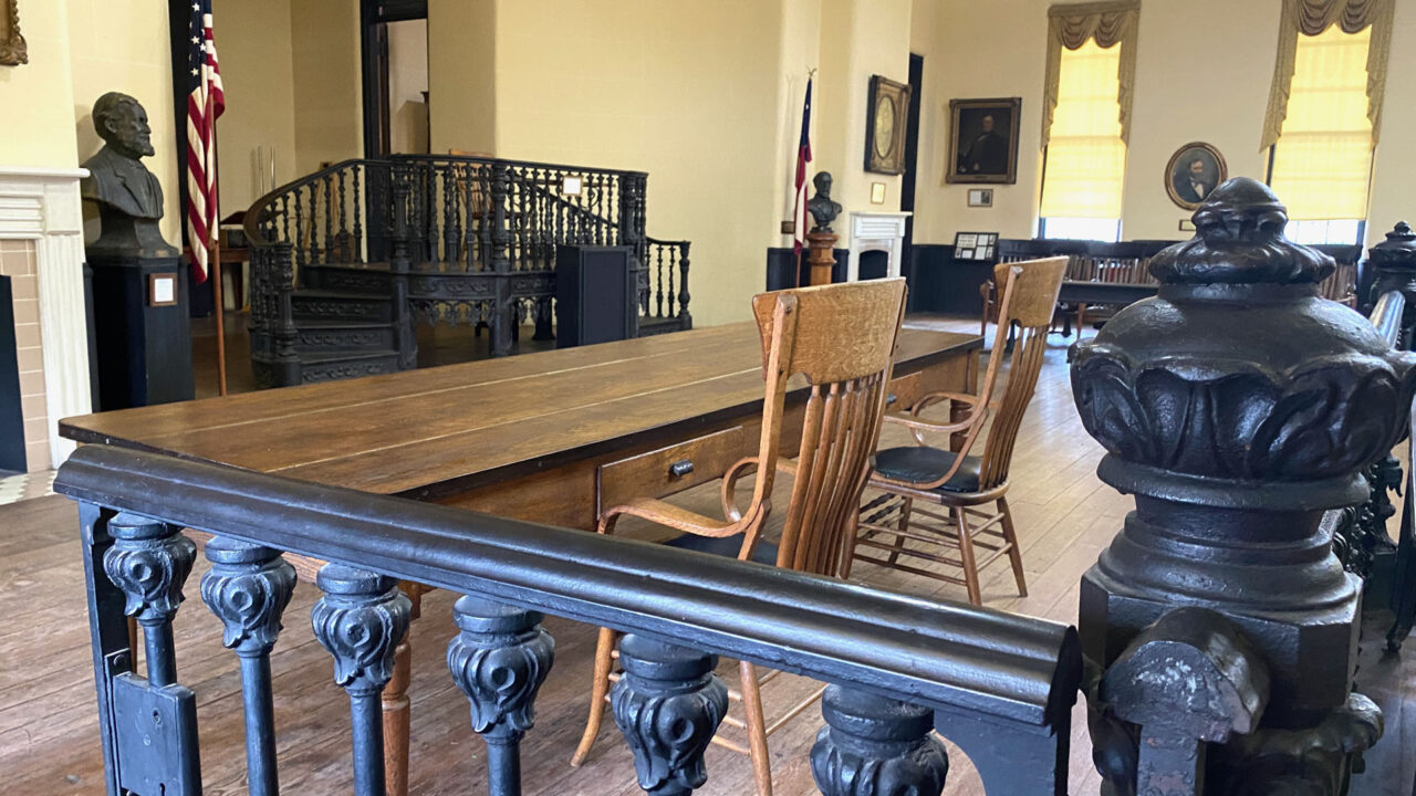 First is the Old Court House Museum, built in 1858. It’s Vicksburg’s most historic building and oldest museum. The court house still retains the original historic courtroom from 1859 with its original ironwork including the iron judge’s dais and railings. The color of the room is authentic, but theatre seat benches and risers were added in late 1800s. There’s an Iron Staircase connecting the first and second floors made by Baker Iron Company from Cincinnati, Ohio and brought by steamboat down the Mississippi River in the late 1850s. On the day Vicksburg surrendered, Union soldiers flocked into the building, and a group of drunken staff officers climbed the stairway, singing and waving a captured flag. When one of them looked down and saw “Baker Iron Company, Cincinnati OH” on the stair, he cursed “The impudence of the people who thought they could whip the United States when they couldn’t even make their own stairs!”