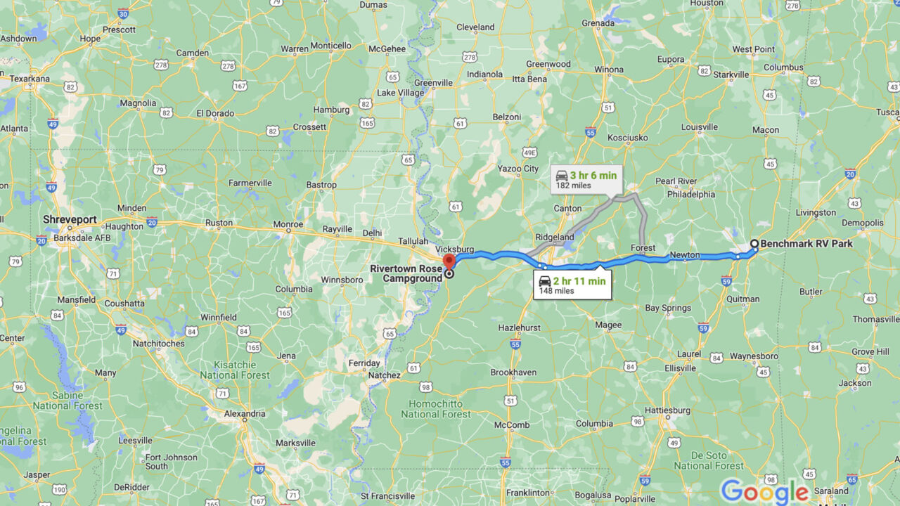 First we traveled 165 miles east from Montgomery, AL to Marion, MS and stayed 2 nights at Benchmark RV Park. This stop was just to break up the drive to our destination of Vicksburg, MS. On Wed., Jan. 24th, (2024) we traveled another 148 miles east to land at Rivertown Rose Campground in Vicksburg.
