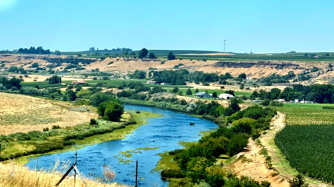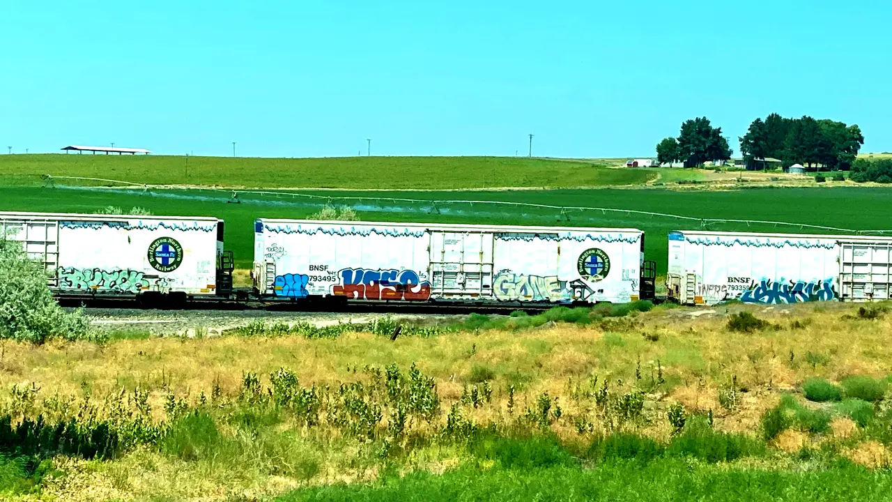 On Tue., July 23rd (2024) we drove 90 miles southwest to arrive in Prosser, Washington at Wine Country RV Park. We passed a long line of white BNSF box cars all decorated with graffiti. Quite impressive! Shortly after that we passed a large freight yard. Prosser is considered the birthplace of the Washington wine industry, and we passed vineyard after vineyard along our drive! The Yakima River runs through the city of Prosser. The streets in town have fitting names like Wine Country Road, Chardonnay Avenue and Merlot Drive.