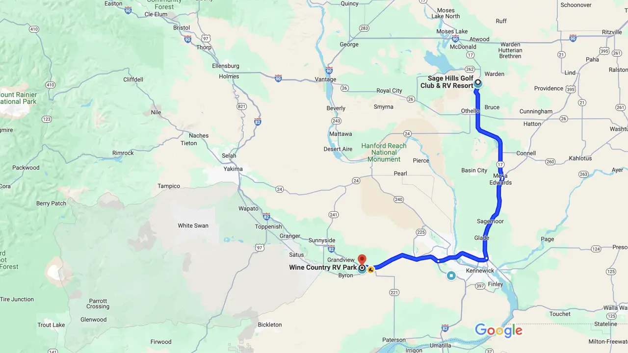 The pod arrived at Sage Hills Golf & RV Resort in Warden, Washington on Tue., July 16th (2024), after traveling 148 miles southwest from Coeur d’Alene, ID. The town of Warden is in the southeastern portion of the state.